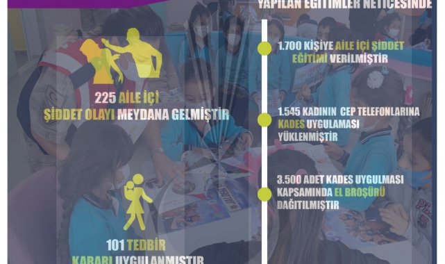Bu arada, bin 700 kişiye aile içi şiddet eğitimi verildi. Bin 545 kadının cep telefonlarına Kadın Destek Programı (KADES) uygulaması yüklendi. 3 bin 500 adet KADES uygulaması kapsamında el broşürü dağıtıldı.